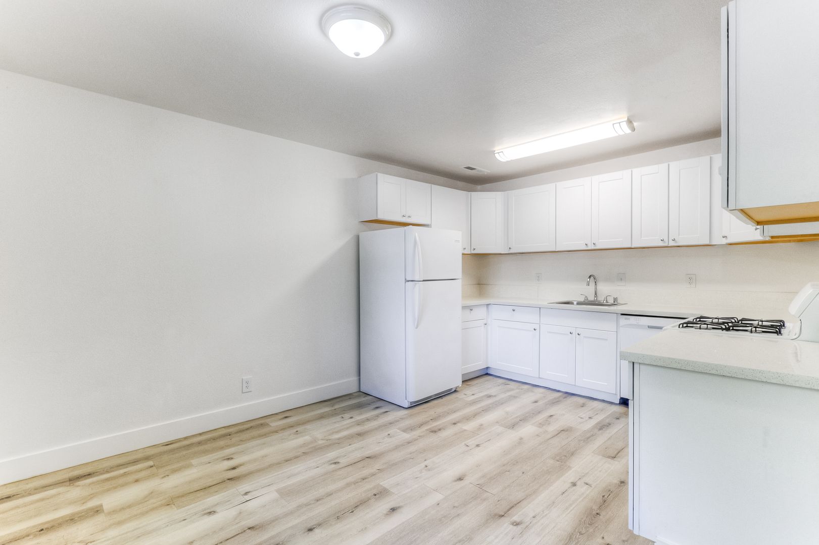 The kitchen is designed with both style and function in mind, featuring granite countertops, a gas stove, dishwasher, garbage disposal, and plenty of cabinet and storage space to keep everything organized.